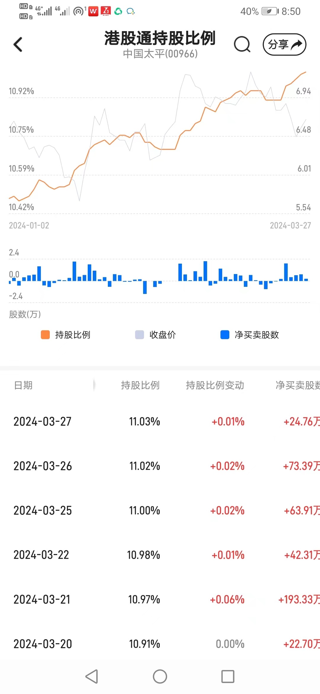 智通财经APP获悉,港股通持股比例数据显示,南向资金正在持续增持中国太平(00966)。在最近的6个交易日内,累计净买入420.4万股,持股比例从10.91%提升至11.03%。其中在业绩公布后的次日净买入73万股。