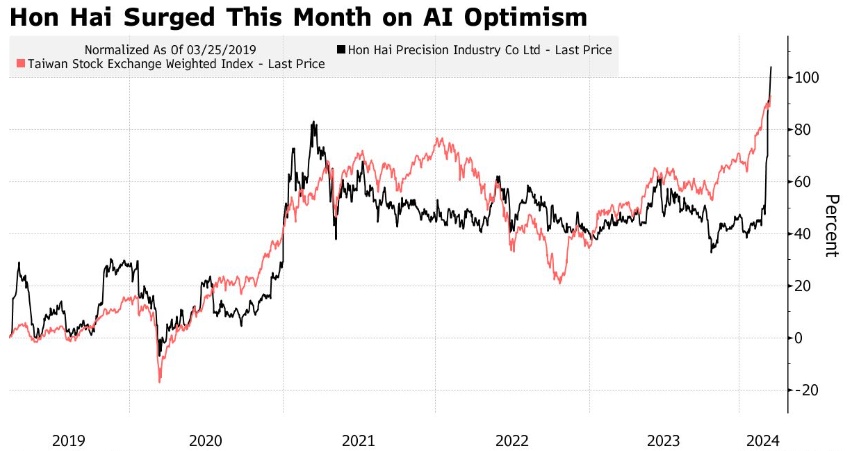 智通财经获悉,由于人工智能(AI)热潮盖过了对智能手机行业复苏乏力的担忧,富士康母公司鸿海精密股价飙升。为苹果公司生产iPhone的鸿海精密股价周四上涨3.7%,创下盘中新高。去年,由于担心高端手机需求低迷,苹果在中国大陆的销售将会放缓,该公司在中国台湾股市的表现非常落后,但第四季度超出预期的收益引发了对该公司人工智能服务器需求的乐观情绪。今年迄今,该股已累计上涨46%。