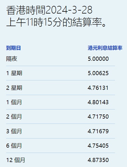 智通财经APP获悉,3月28日,港元拆息在季结及复活节长假前偏软,但隔夜息急弹90基点,高见5%,为1月31日以来最高,一周钱则跌21基点报5.00625%,与楼按相关的一个月拆息微降至4.80143%,为近一周低位。