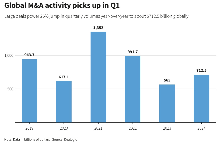 智通财经APP了解到,全球并购交易在经历了2023年的全年极度低迷时期后,终于在2024年第一季度大举反弹,主要得益于全球科技行业大型并购交易陆续回归,这一趋势也令等待并购交易全面回暖的投资银行家和律师群体欢呼雀跃。Dealogic的最新统计数据显示,全球并购交易总额实现同比大幅增长30%,至约7,551亿美元,其中,交易价值超过100亿美元的大型交易数量跃升至14笔,而去年同期仅仅为5笔。