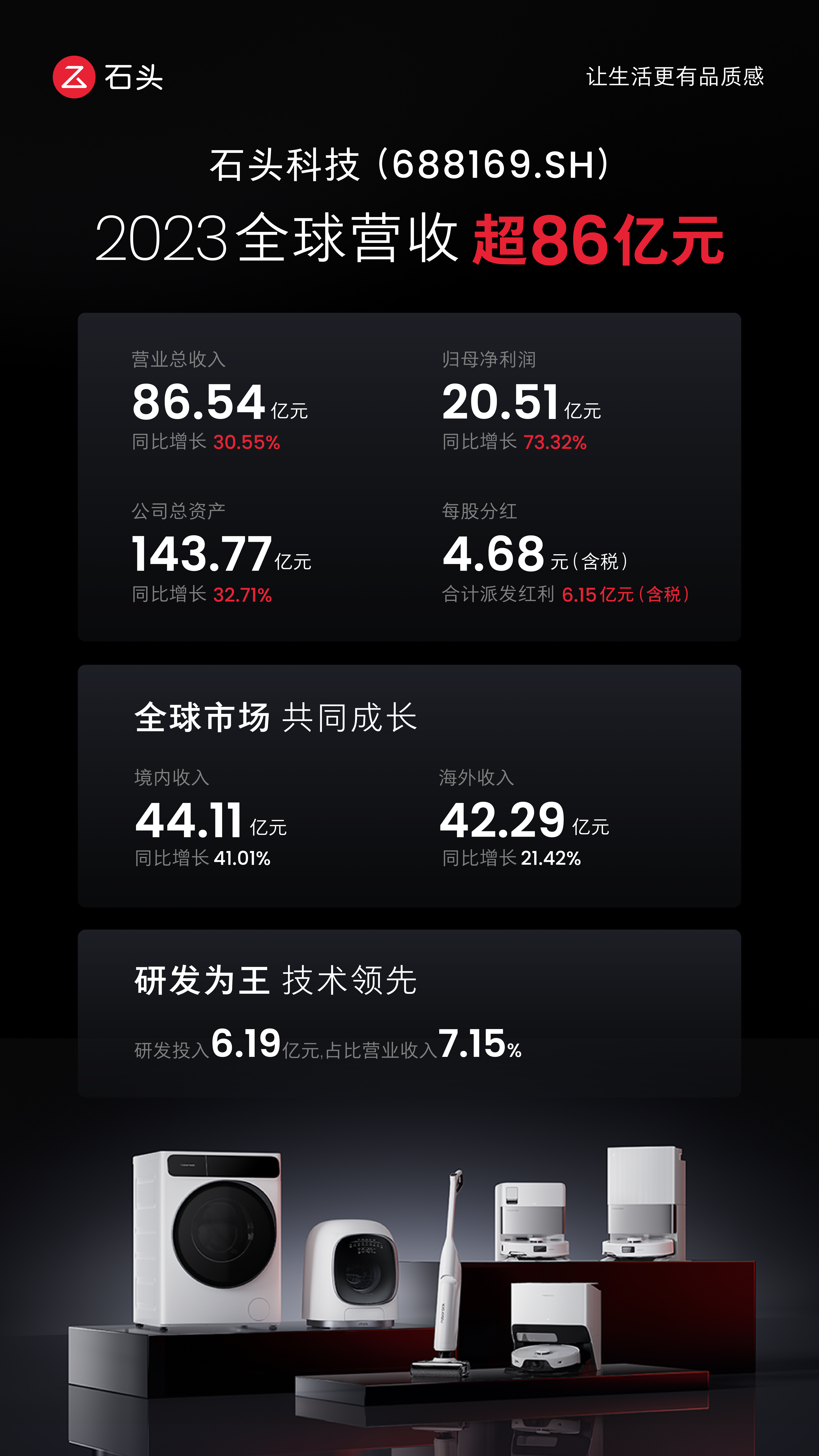 3月28日晚,石头科技(688169.SH)披露2023年度财报。去年,公司实现营收86.54亿元,同比增长30.55%,归母净利润20.51亿元,同比增长73.32%。近期,清洁电器领域行业上市企业相继披露财报,行业大势走低。石头科技业绩表现逆势实现大增,受到外界高度关注。