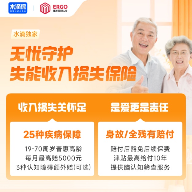 为更好保障老年人群,水滴保联合德华安顾人寿上线“无忧守护”失能收入补偿险,不仅可作为工作失能收入补偿,也可作为退休后的生活失能补偿。该产品投保年龄为19周岁至70周岁,最高可续保至90周岁,结节、息肉客户也有投保机会。保障严重阿尔茨海默病、严重原发帕金森疾病、严重脑中风后遗症等25种老年高发疾病,或因意外导致的1~3级伤残等级的情况。每月收入补偿金最高为5000元,无需每年做失能鉴定,可一直领取最高10年。
