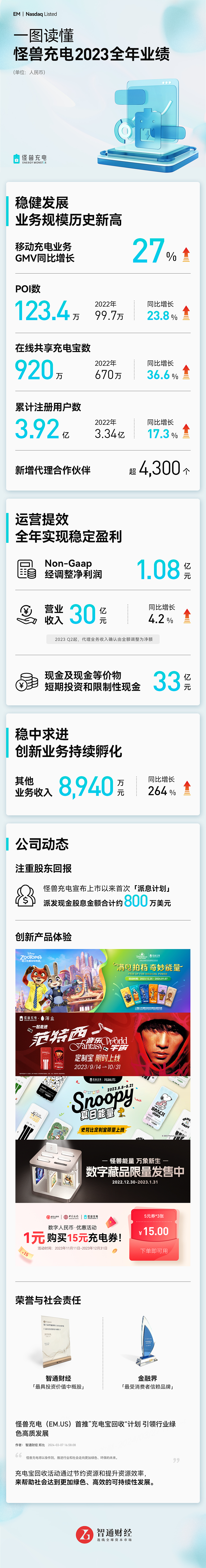 截至2023年12月31日,怪兽充电在全国共有123.4万个POI(点位数),累计注册用户数达3.915亿,在线共享充电宝920万个。2023年移动充电业务GMV同比增长超27%,全年订单量达6.56亿。
