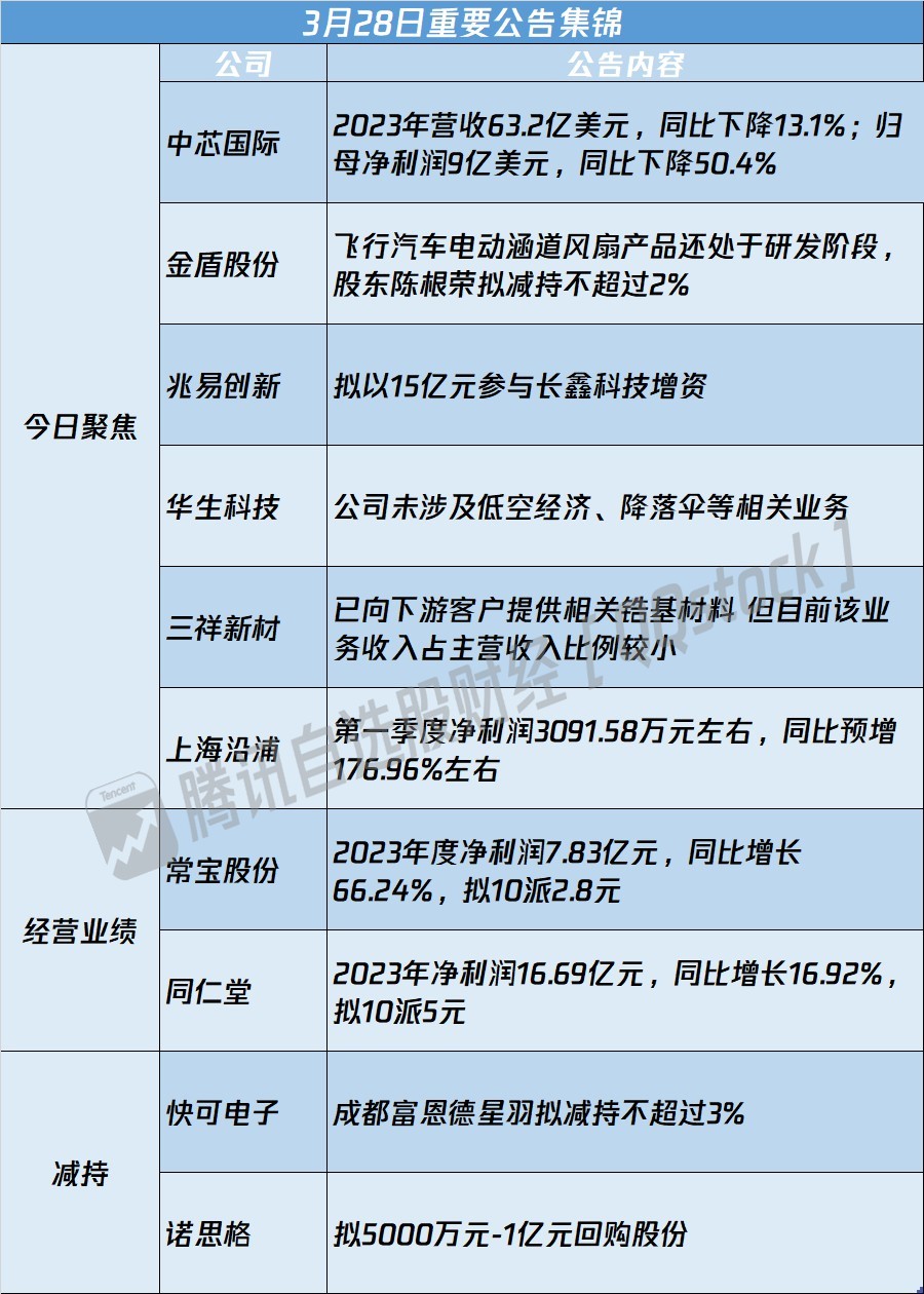 1、中芯国际:2023年营收63.2亿美元,同比下降13.1%;归母净利润9亿美元,同比下降50.4%