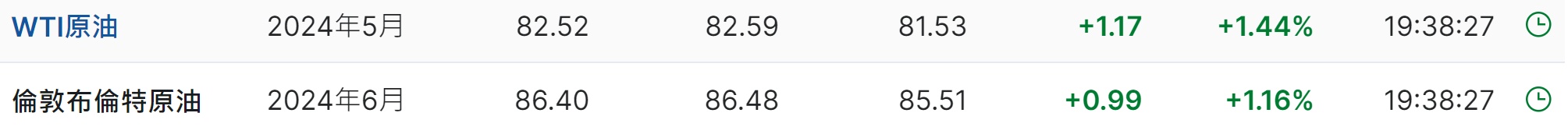 3. 截至发稿,WTI原油涨1.44%,报82.52美元/桶。布伦特原油涨1.16%,报86.40美元/桶。