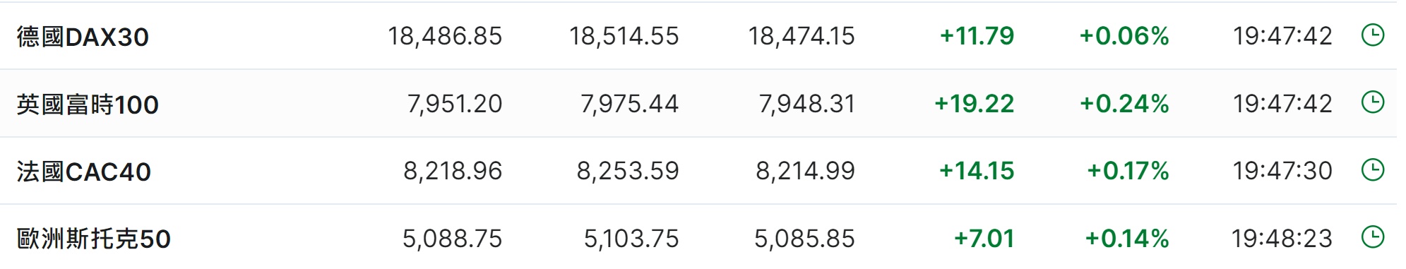 2. 截至发稿,德国DAX指数涨0.06%,英国富时100指数涨0.24%,法国CAC40指数涨0.17%,欧洲斯托克50指数涨0.14%。