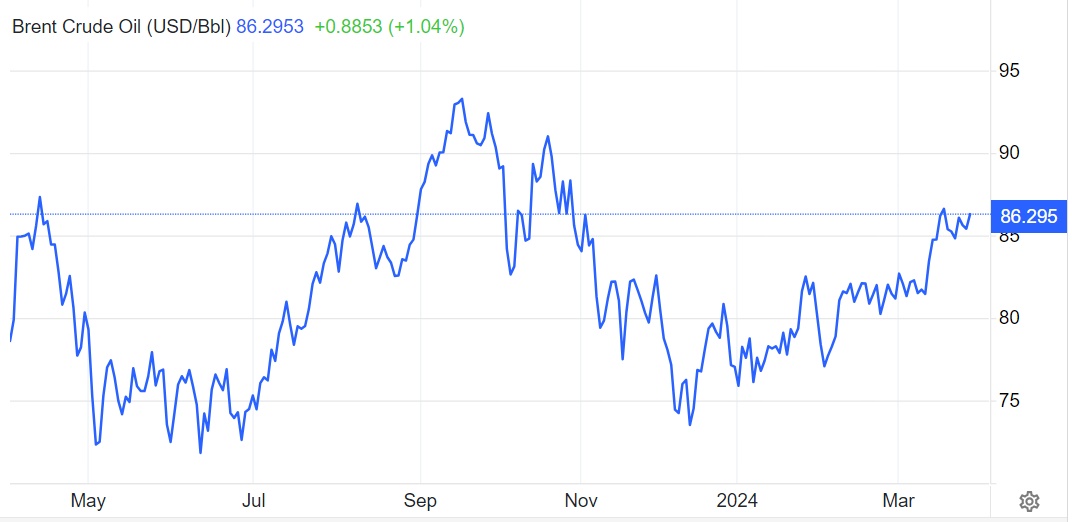 华尔街大行高盛近日则在一份报告中预计,由于红海运输危机导致经合组织国家的商业原油库存的下降步伐略高于预期,该行将其2024年夏季布伦特原油峰值预测上调2美元,至每桶87美元。德国商业银行(Commerzbank)则预计今年年底布伦特原油有望达到90美元。截至发稿,布伦特原油价格上涨1.04%,至86.30美元/桶,继上一季度暴跌超10%之后,有望实现超过13%的季度涨幅,收复上季度失地。