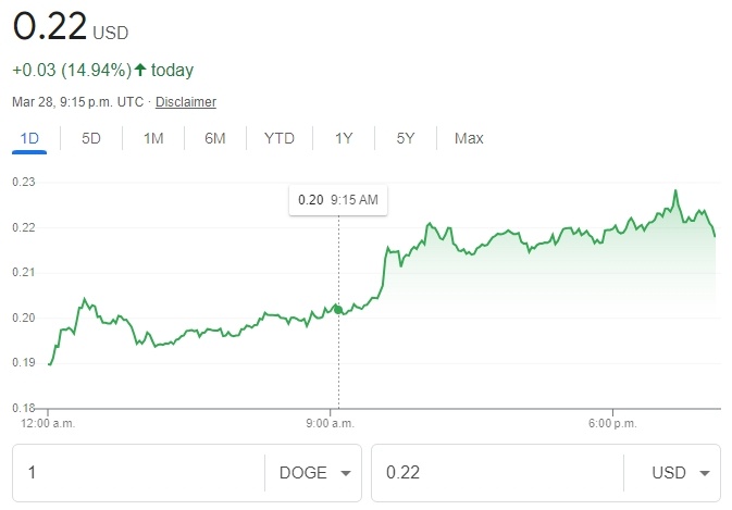 随着加密货币市场的持续活跃,狗狗币价格近期呈现出显著上涨。智通财经APP获悉,在3月28日周四,狗狗币的价值飙升近15%,达到0.2203美元,这是自2021年11月以来的最高点。在过去一周内,狗狗币的价格增长了40%,而今年至今的涨幅已达145%,在过去一年中上涨了191%。
