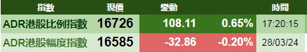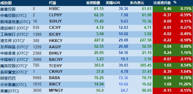 智通财经APP获悉,周四美股三大指数涨跌不一,港股ADR指数上涨,按比例计算,收报16726点,较香港收市上涨108.11点或0.65%。
