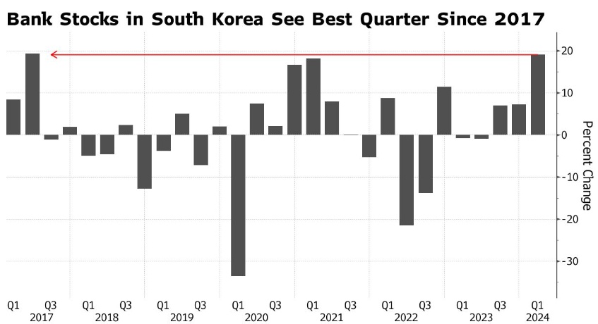 投资者被吸引回银行股,因为他们猜测韩国政府的“企业价值提升”计划将提高股东回报。韩国交易所本月表示,该计划的细节将于5月敲定。该计划旨在通过改善管理治理来提高估值。