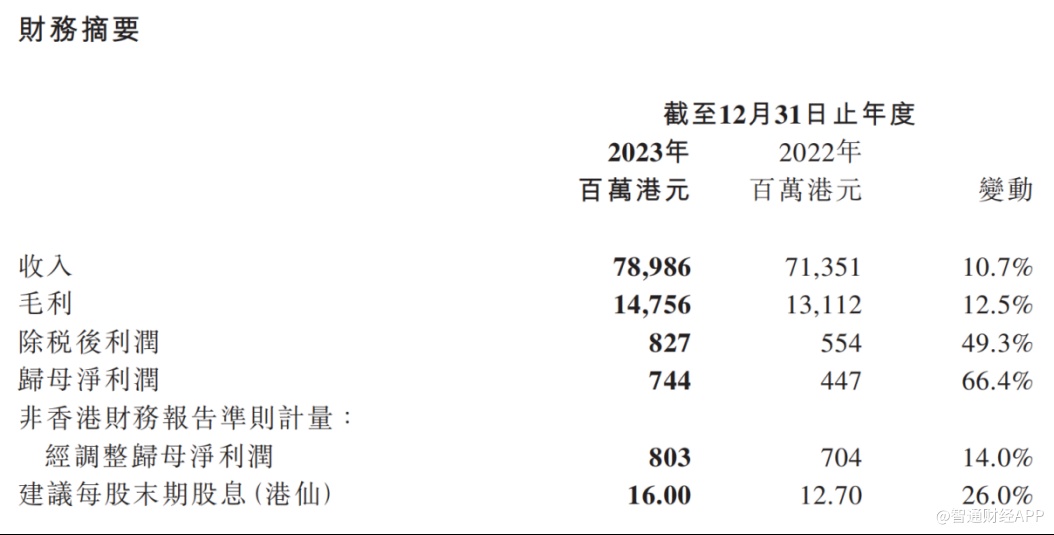 财报显示,公司全年实现收入789.9亿港元,同比增长10.7%;整体毛利同比增长12.5%至147.6亿港元,整体毛利率同比提升0.3个百分点至18.7%,归母净利润达至7.4亿港元,同比增长66.4%,经调整归母净利润8.0亿港元,同比增长14.0%。