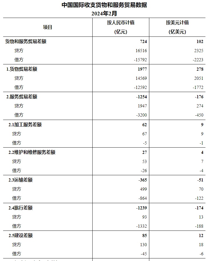 按美元计值,2024年2月,我国国际收支货物和服务贸易出口2325亿美元,进口2223亿美元,顺差102亿美元。