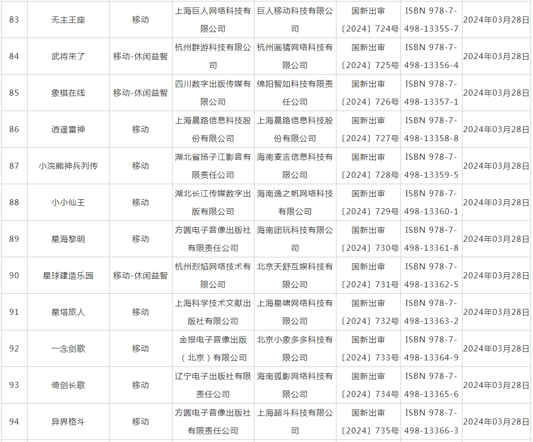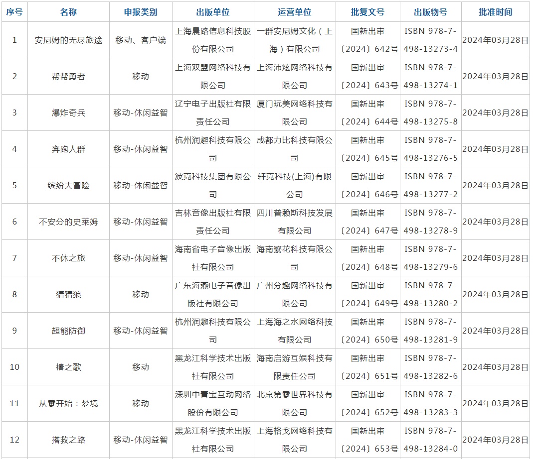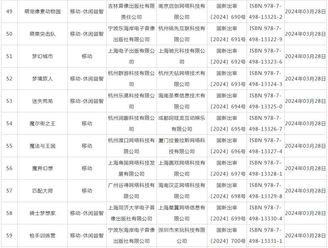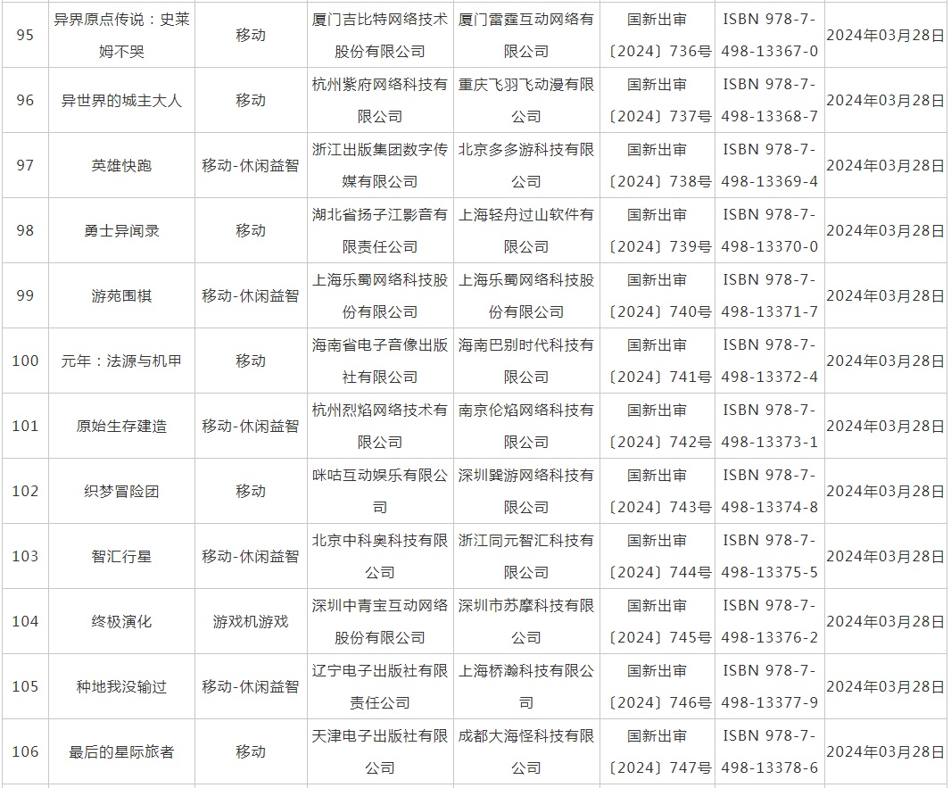 智通财经APP获悉,3月29日,国家新闻出版署发布2024年3月份国产网络游戏审批信息,共107款游戏获批。其中包括中青宝(300052.SZ)的《从零开始:梦境》《落樱2:千乐之章》;吉比特(603444.SH)的《异界原点传说:史莱姆不哭》;三七互娱(002555.SZ)的《时光大爆炸》等。