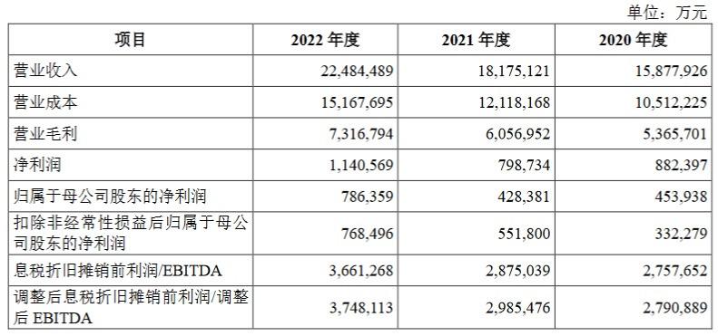 财务方面,于2020年度、2021年度及2022年度,公司实现营业收入分别约为1587.79亿元、1817.51亿元、2248.45亿元。公司净利润分别约为88.24亿元、79.87亿元、114.06亿元人民币。