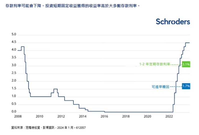 欧洲央行的数据显示,平均存款利率(可提早赎回)仅为1.7%。因此通过投资短期固定收益,投资者可于相对较长时间内锁定较高收益率。