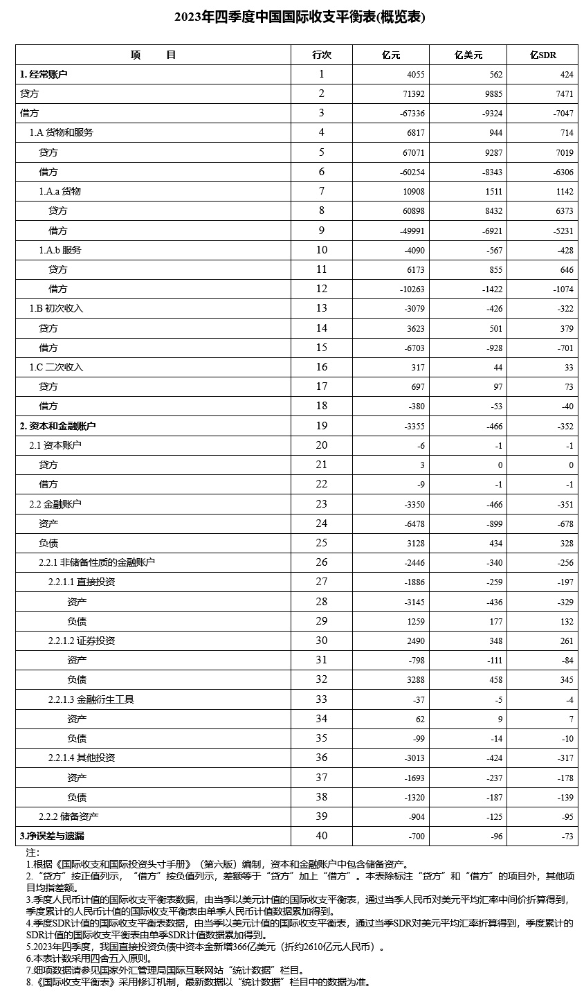 按美元计值,2023年四季度,我国经常账户顺差562亿美元,其中,货物贸易顺差1511亿美元,服务贸易逆差567亿美元,初次收入逆差426亿美元,二次收入顺差44亿美元。资本和金融账户逆差466亿美元,其中,资本账户逆差1亿美元,非储备性质的金融账户逆差340亿美元,储备资产增加125亿美元。