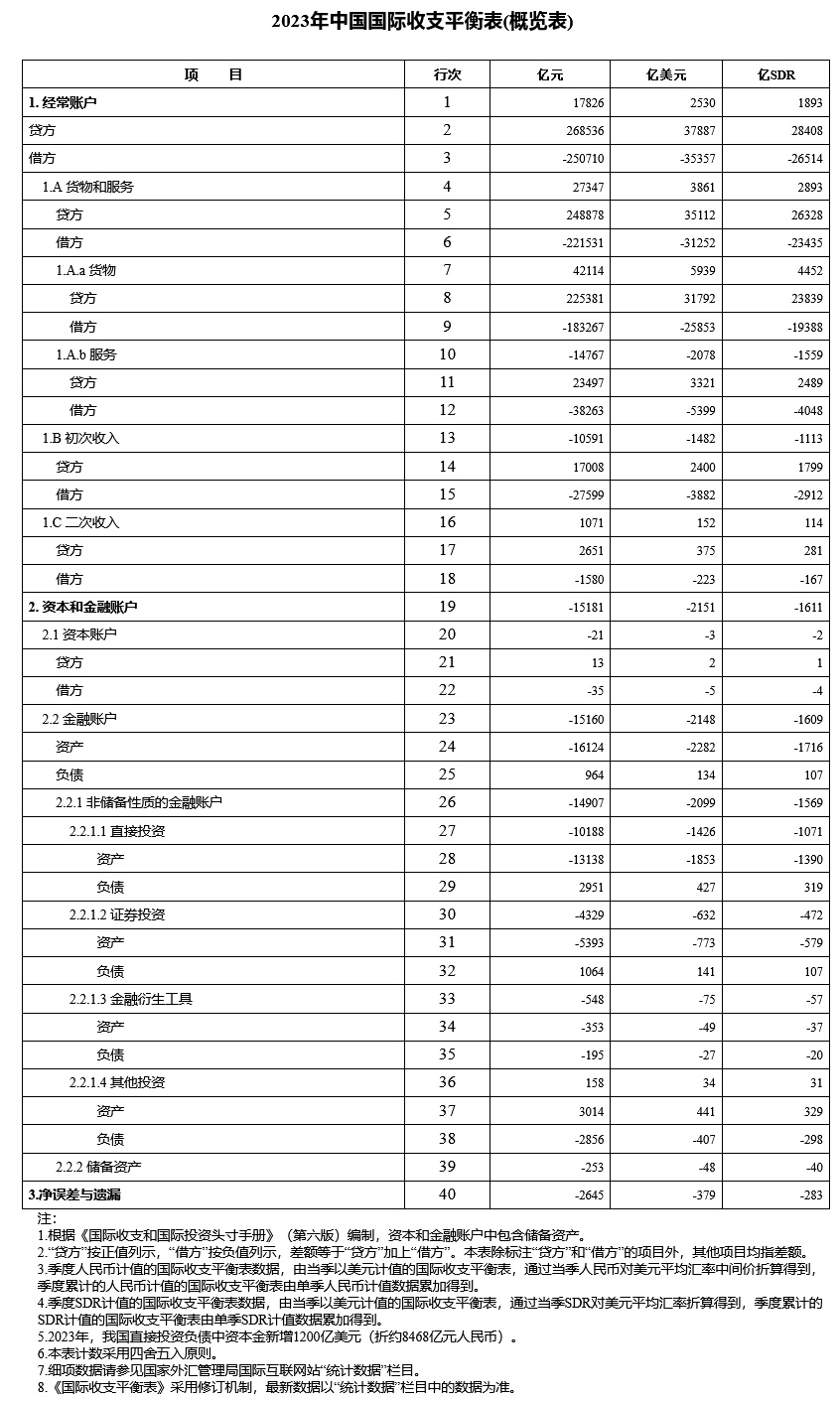 按美元计值,2023年,我国经常账户顺差2530亿美元,其中,货物贸易顺差5939亿美元,服务贸易逆差2078亿美元,初次收入逆差1482亿美元,二次收入顺差152亿美元。资本和金融账户逆差2151亿美元,其中,资本账户逆差3亿美元,非储备性质的金融账户逆差2099亿美元,储备资产增加48亿美元。