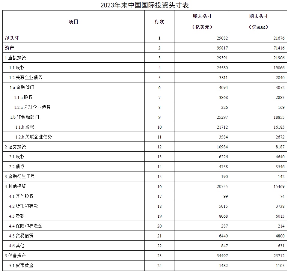 国家外汇管理局公布2023年末我国国际投资头寸表
