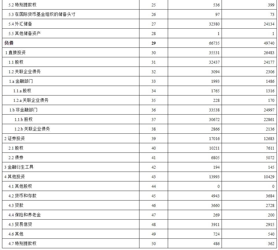 在对外金融资产中,直接投资资产29391亿美元,证券投资资产10984亿美元,金融衍生工具资产190亿美元,其他投资资产20755亿美元,储备资产34497亿美元,分别占对外金融资产的31%、11%、0.2%、22%和36%;在对外负债中,直接投资负债35531亿美元,证券投资负债17016亿美元,金融衍生工具负债194亿美元,其他投资负债13993亿美元,分别占对外负债的53%、25%、0.3%和21%。