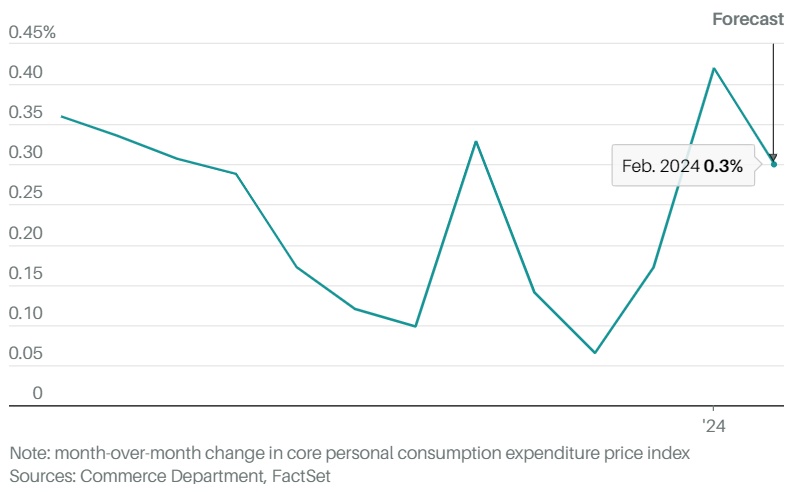智通财经APP获悉,美国将于今天20:30公布2月个人消费支出(PCE)价格指数。目前,市场普遍预计,2月核心PCE物价指数将环比上涨0.3%,涨幅略低于1月份0.4%的涨幅,预计同比上涨2.8%,与前值持平。整体PCE通胀环比上升0.4%,增速快于1月份的0.3%,同比增速预计从1月份的2.4%攀升至2.5%。