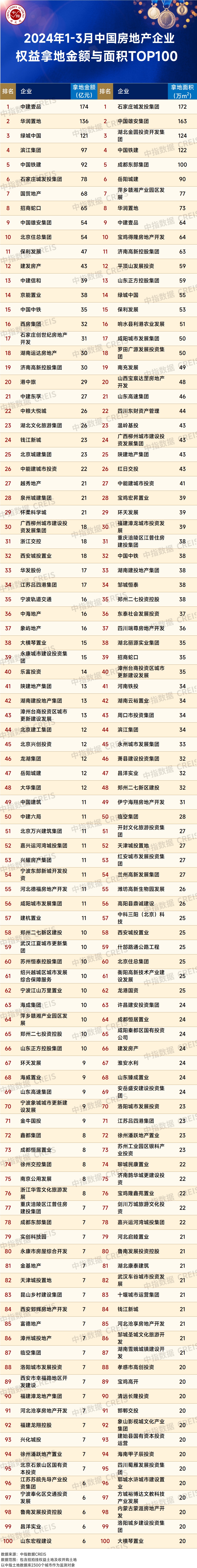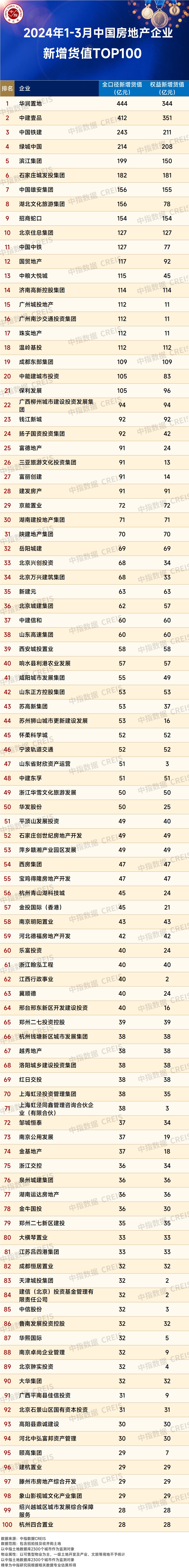 智通财经APP获悉,中指研究院最新发布《2024年1-3月全国房地产企业拿地TOP100排行榜》,2024年1-3月,TOP100企业拿地总额2217亿元,同比增长14.9%,较1-2月同比增速有所下降。2月,北京、深圳等一线城市拍地,土地出让金额较高,抬高了拿地总额。3月,虽然部分一二线城市依旧有土地推出,但推地数量和质量均不如2月,加之当前房企拿地更加谨慎,导致1-3月房企拿地同比增速有所下降。从新增货值来看,华润置地、中建壹品和中国铁建位列前三。
