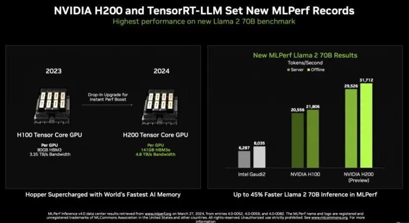我们还很高兴能够使用 NVIDIA HGX H200 AI 超级计算平台(由最新的 H200 Tensor Core GPU 提供支持)首次提交作品。 HGX H200 采用高性能定制散热解决方案,在新的 Llama 2 70B LLM 测试中,性能比 HGX H100 高出 45%。而且,NVIDIA GH200 Grace Hopper 超级芯片将 NVIDIA Grace CPU 与 NVIDIA Hopper GPU 结合在一个多功能、易于部署的模块中,将 H100 GPU 的卓越性能扩展到法学硕士、文本到图像生成 AI 和推荐人。