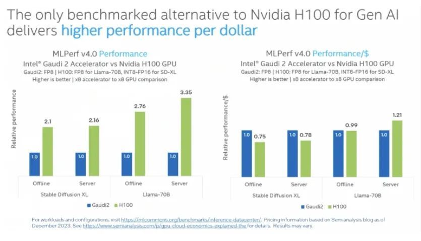 在基于最新 MLPerf 推理运行进行比较时,英特尔展示了 Gaudi 2 与 Nvidia H100 在 Stable Diffusion XL 和 Llama 2 工作负载上的性能和成本比较。