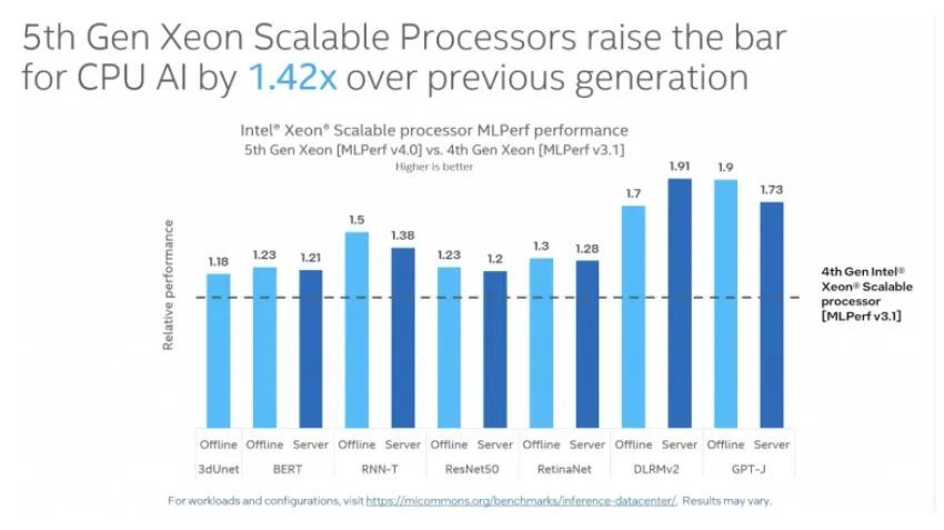 这是英特尔第五代至强处理器首次出现在 MLPerf 中,Shah 展示了其与第四代至强处理器对比的结果。