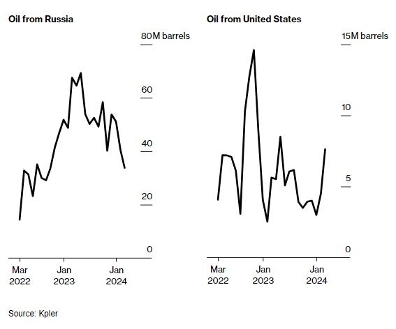 其中,印度——全球第三大原油进口国,也是俄罗斯继中国后的第二大买家——是美国石油最新涌入的市场。据原油追踪公司Kpler的数据显示,美国对印度的出口量预计将在3月份跃升至近一年来的最高点。