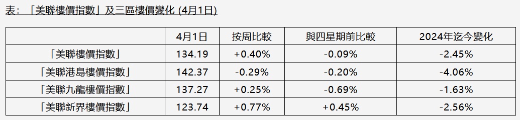 楼价方面,“美联楼价指数”最新报134.19点,按周升0.4%,连升2星期;不过比起四星期前仍跌0.09%,而2024年迄今跌幅收窄至2.45%。
