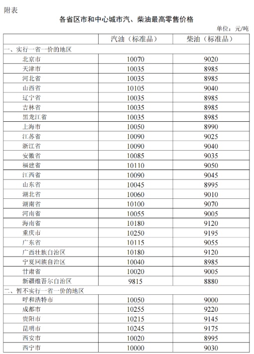 智通财经APP获悉,国家发改委官网4月1日消息,根据近期国际市场油价变化情况,按照现行成品油价格形成机制,自2024年4月1日24时起,国内汽、柴油价格(标准品,下同)每吨分别提高200元、190元。调整后,各省(区、市)和中心城市汽、柴油最高零售价格见附表。