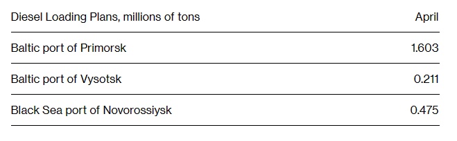 行业数据显示,4月,俄罗斯黑海和波罗的海的三个主要港口的柴油装货量(包括一些来自白俄罗斯的装货量)将降至229万吨左右。根据情报公司Kpler的数据计算,这相当于约56.9万桶/日,较3月这些港口的实际柴油装货量72.4万桶/日下降了21%。