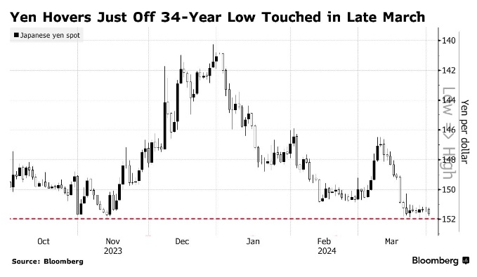 最近一段时间,日本官员一直表示,如果有必要,他们愿意在货币市场上采取行动,以阻止日元贬值。2024年迄今为止,日元兑美元汇率已下跌约7%,是过去一年10国集团中表现最差的货币。