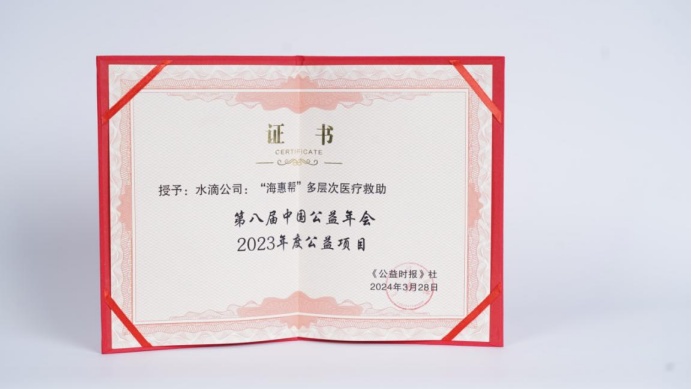 《公益时报》社自2016年起举办中国公益年会,至今已经成功举办八届。本届年会还现场揭晓了2023年度中国公益人物、2023年度中国公益企业以及2023年度中国公益项目的获奖名单。其中,水滴公司及其创始人兼CEO沈鹏分别荣获2023年度中国公益企业、2023年度中国公益人物,水滴公司参与建设的“海惠帮”多层次医疗救助项目入选2023年度公益项目。