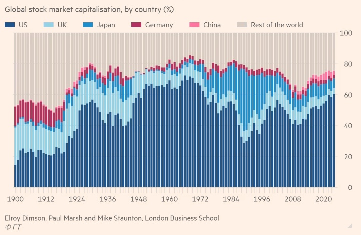 根据剑桥大学的埃尔罗伊•迪姆森和伦敦商学院的保罗•马什和迈克•斯汤顿的研究,美股占全球股市市值已达到“惊人”的60.5%。这一比例高于1989年的28.6%,是1973年以来的最高水平。