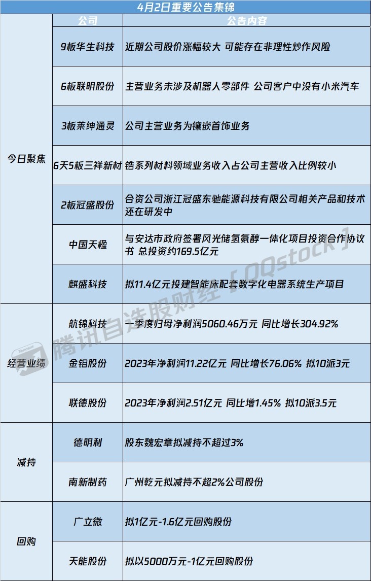1、泰和科技:一季度净利润为3500万元至4500万元,同比预增8.9%至40.01%