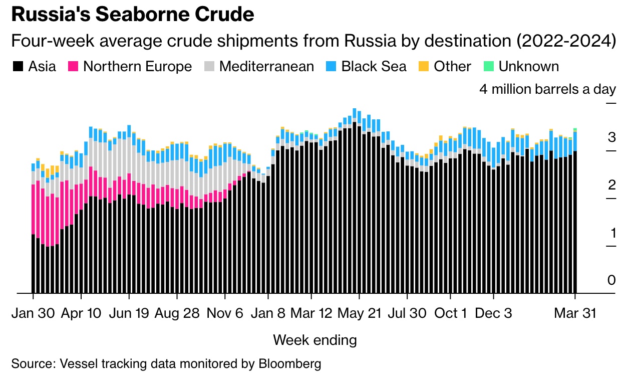 按俄罗斯海运原油出货目的地划分,在截至3月31日的过去四周内,运往亚洲地区的平均出货量为300万桶/日,运往黑海地区的平均出货量为40万桶/日,运往未知地区的平均出货量为10万桶/日。