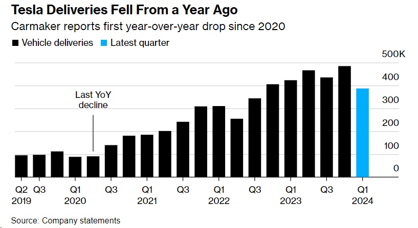 智通财经APP获悉,特斯拉(TSLA.US)遭遇了自新冠疫情初期以来的首次同比销量下降。特斯拉周二宣布,第一季度生产了433,371辆汽车,交付了386,810辆汽车。交付量远远低于市场预期的449,080辆。相比之下,特斯拉在去年第四季度共交付了484,507辆汽车,而去年第一季度交付了422,875辆。