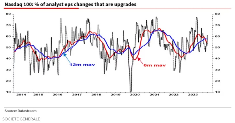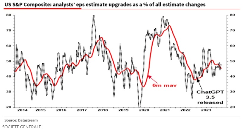 到目前为止,人工智能的炒作并未转化为对即将到来的更强盈利的预期。在过去六个月中,无论是标普1500综合指数还是纳斯达克100指数,分析师的盈利修正的上调比例呈下降趋势。