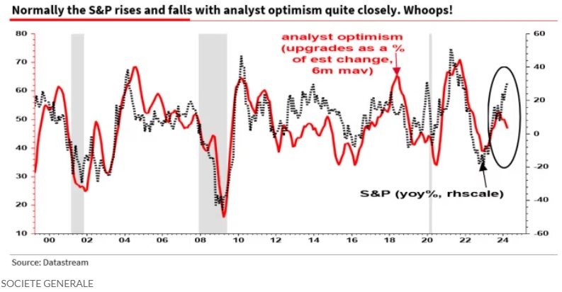 爱德华兹指出,过去,标准普尔500指数一直密切跟踪分析师的乐观情绪,但最近,这种关系似乎朝着错误的方向发展。