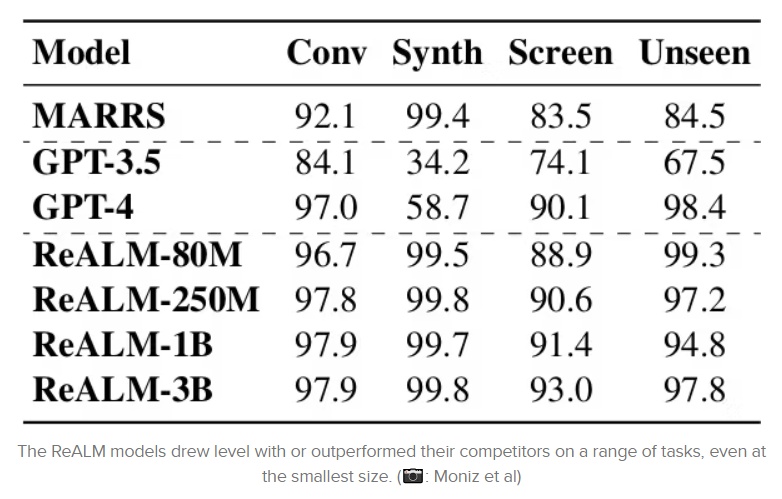“我们的模型在识别不同类型实体方面均取得了显著进步,即使是最小的模型,在屏幕实体识别上的准确率也比原有系统提升了5%以上。与GPT-3.5和GPT-4.0的对比中,我们最小的模型与GPT-4.0的性能相当,而更大的模型则明显优于它,”研究人员表示。