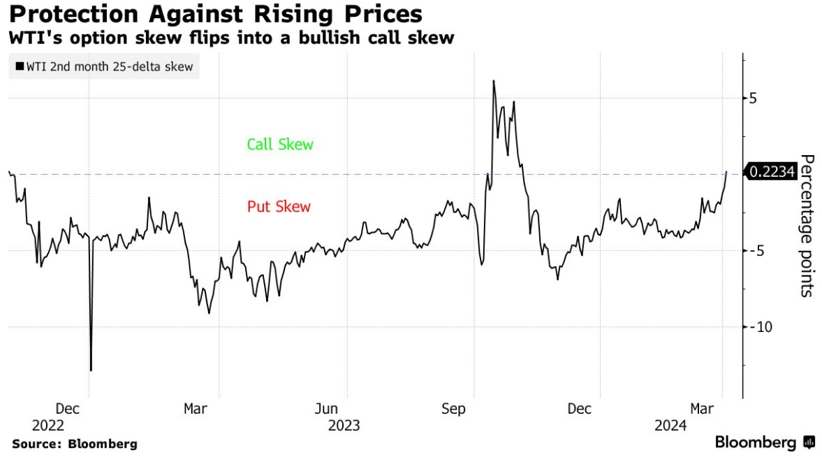 过去一周,布伦特原油和WTI原油的近期市场指标出现了反转,反映出看涨看涨期权的需求多于看跌看跌期权。根据数据,WTI原油第二个月看涨期权偏差(WTI call skew)周二出现自去年11月以来的首次变化。该指标显示,交易员将为从价格上涨中获利的期权支付多少钱。石油期权市场通常倾向于看跌,因为生产商寻求防范价格下跌。