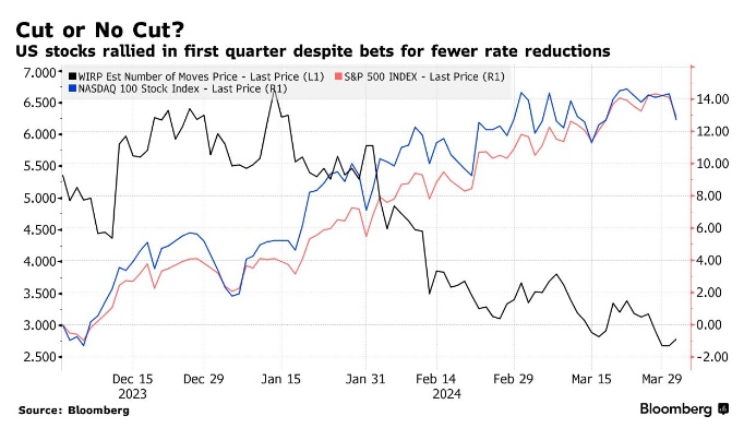 交易员们重新调整了他们对今年全年降息的预期,将预期降息次数从2024年初的六次下调至三次左右。但标普500指数第一季度仍上涨了10%以上。