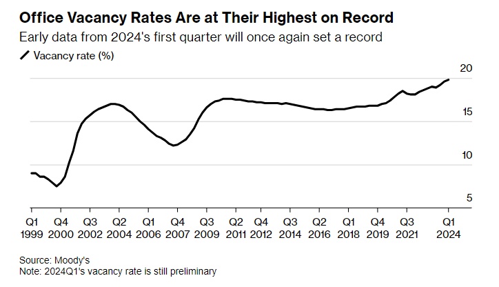 由于混合办公模式显示出更强的持久力,租户继续缩减规模冲击了写字楼行业。美联储的加息周期也伤害了商业地产。穆迪的数据显示,该行业的困境已使空置率超过了1986年和1991年的历史峰值,而且可能还有进一步上升的空间。