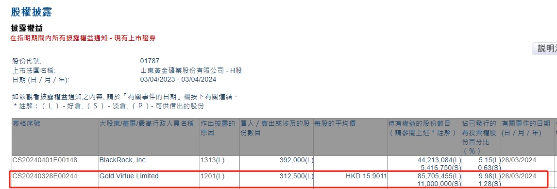 Limited减持山东黄金(01787)31.25万股,每股作价15.9011港元,总金额约为496.91万港元。减持后最新持股数目约为8570.55万股,最新持股比例为9.98%。