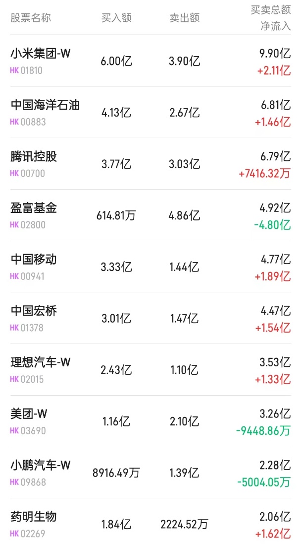 此外,小米集团-W(01810)、药明生物(02269)、美团-W(03690)分别获净买入5.96亿、1.61亿、6924万港元。而小鹏汽车-W(09868)遭净卖出5004万港元。