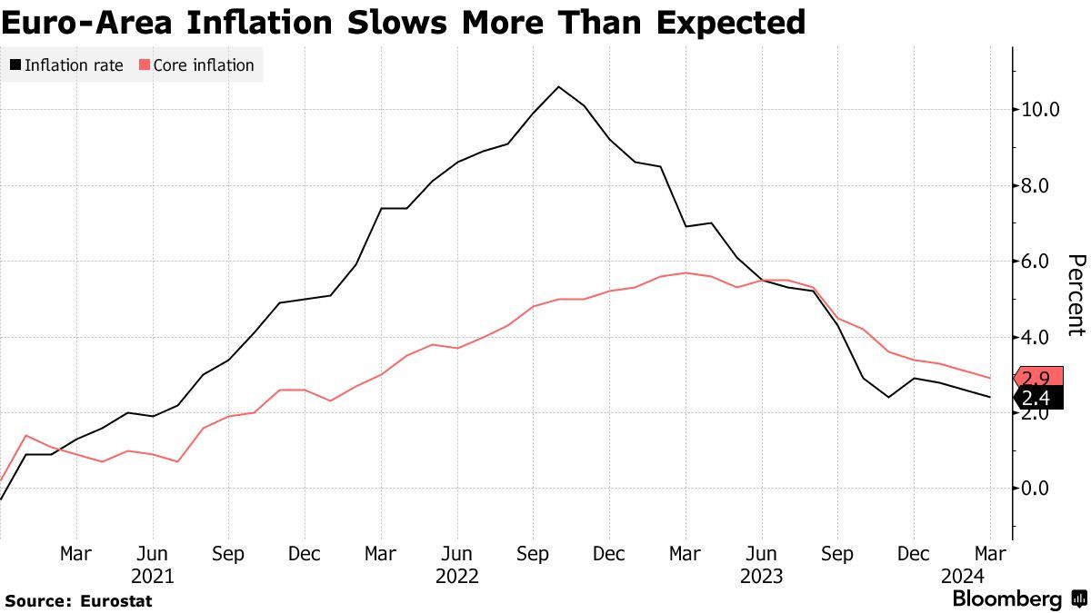 智通财经APP获悉,欧元区3月通胀回落速度快于预期,这巩固了欧洲央行将于6月降息的前景。周三公布的数据显示,欧洲3月调和CPI同比上涨2.4%,低于市场预期的2.6%和前值2.6%;3月核心调和CPI同比上涨3.1%,同样低于市场预期的3.2%和前值3.3%。