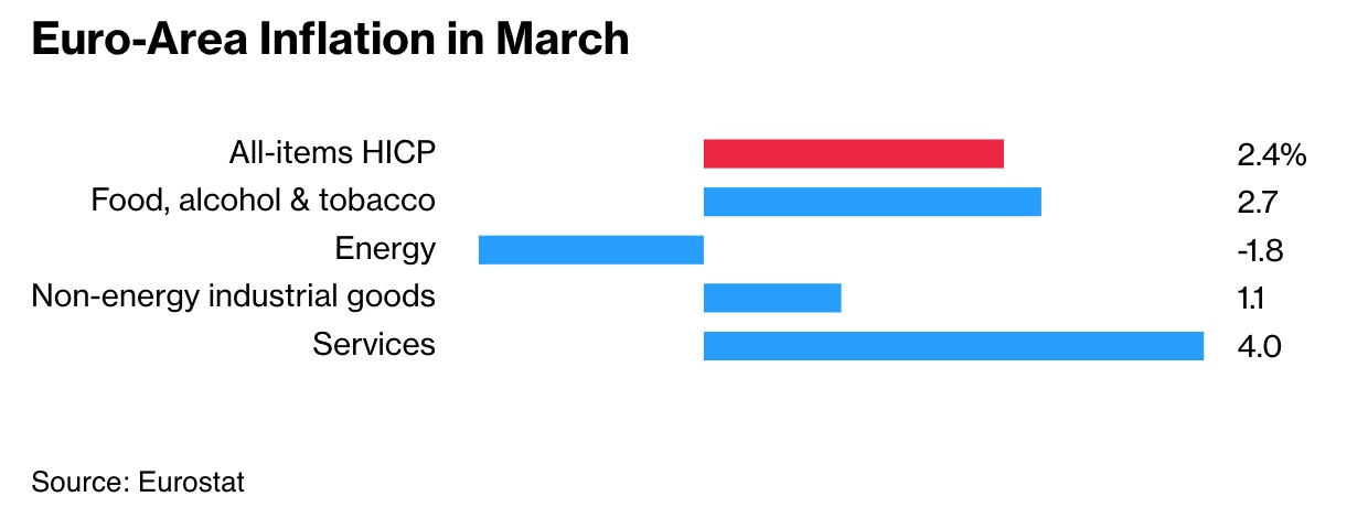 尽管一项关键的薪酬指标显示,到2023年底,欧元区工资增长有所放缓,但工资增幅仍处于4%以上。这将维持服务业的价格压力,因为劳动力对最终成本的影响非常大。数据显示,服务业3月通胀率保持在4%,而非能源工业产品的通胀率降至1.1%。