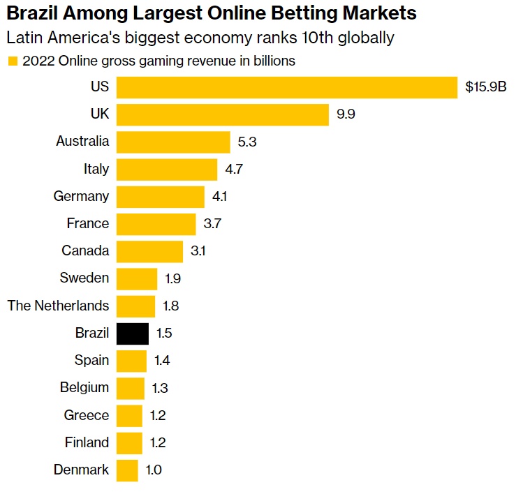 博彩业也经历了类似的快速增长:根据英国最大的在线体育博彩公司之一Entain Plc的数据,到2022年,巴西以15亿美元的总博彩收入排名全球第10位,而一年前巴西还没有进入前15名。