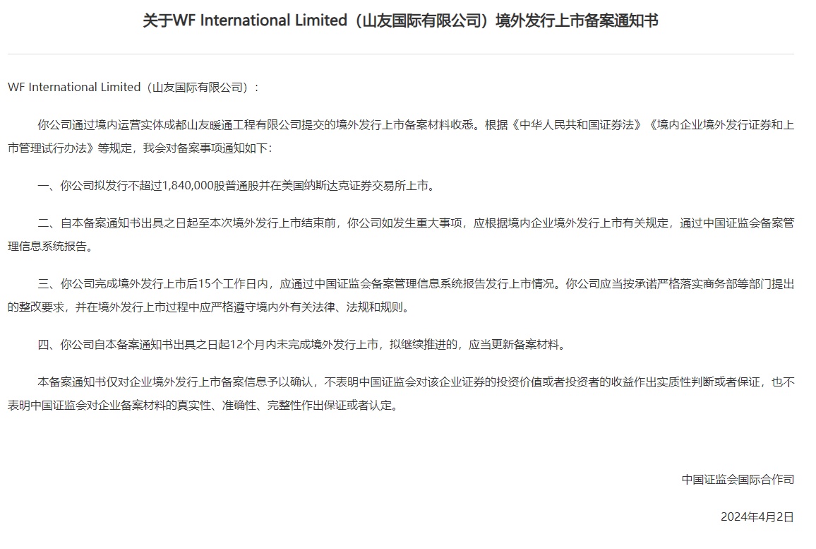 智通财经APP获悉,4月2日,证监会国际合作司发布《关于WF International